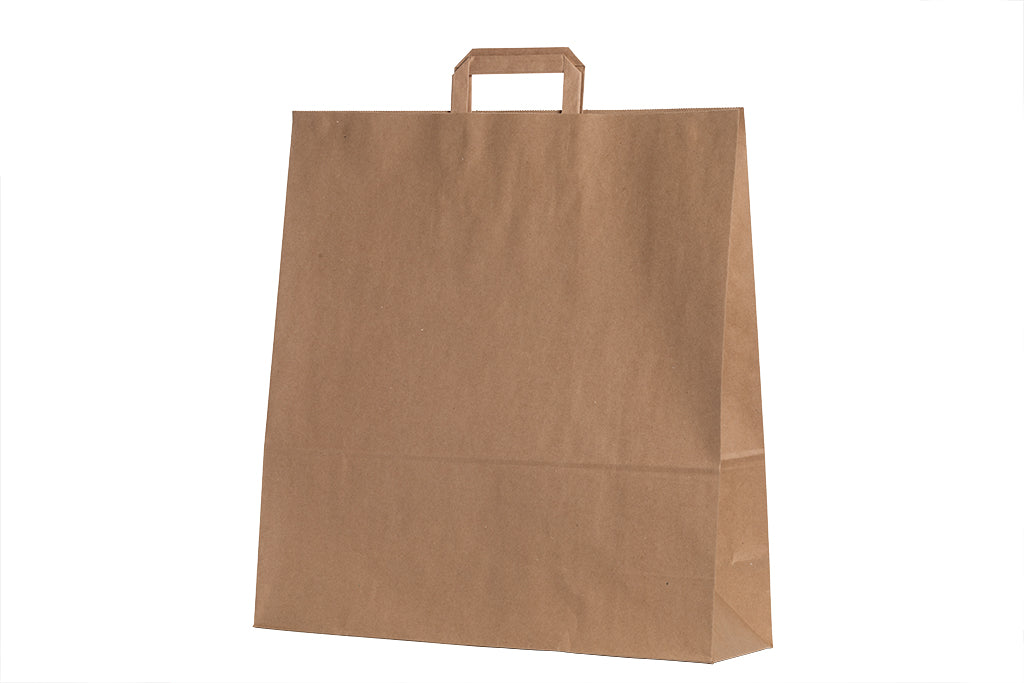 Unsere größte Papiertragetasche bietet Platz für fast alles und eignet sich z.B auch ideal für Bekleidung. Durch die Flachhenkel ist diese Tragetasche aus Papier angenehm zu Tragen und auch vollgepackt sehr reißfest. Sie hält bis zu einem Gewicht von mindestens 8Kg.